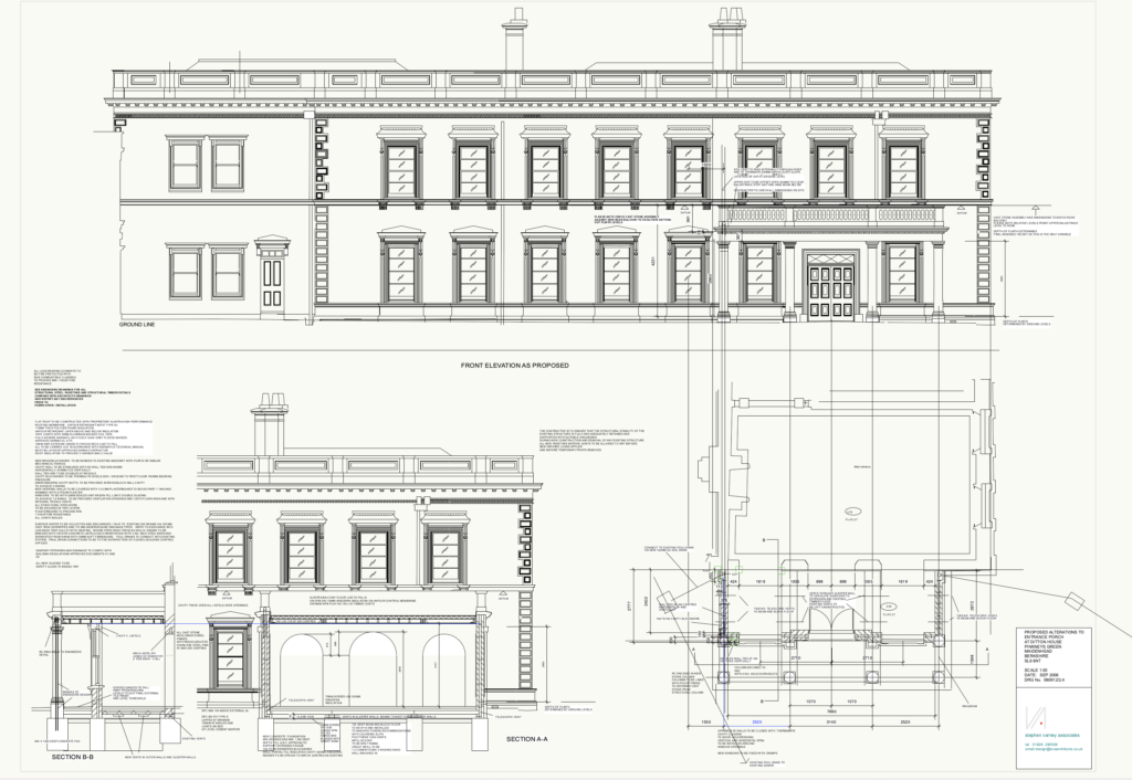 Add a new front entrance and side wing with new bay, windows and stone work to replicate the original in scale and proportion.